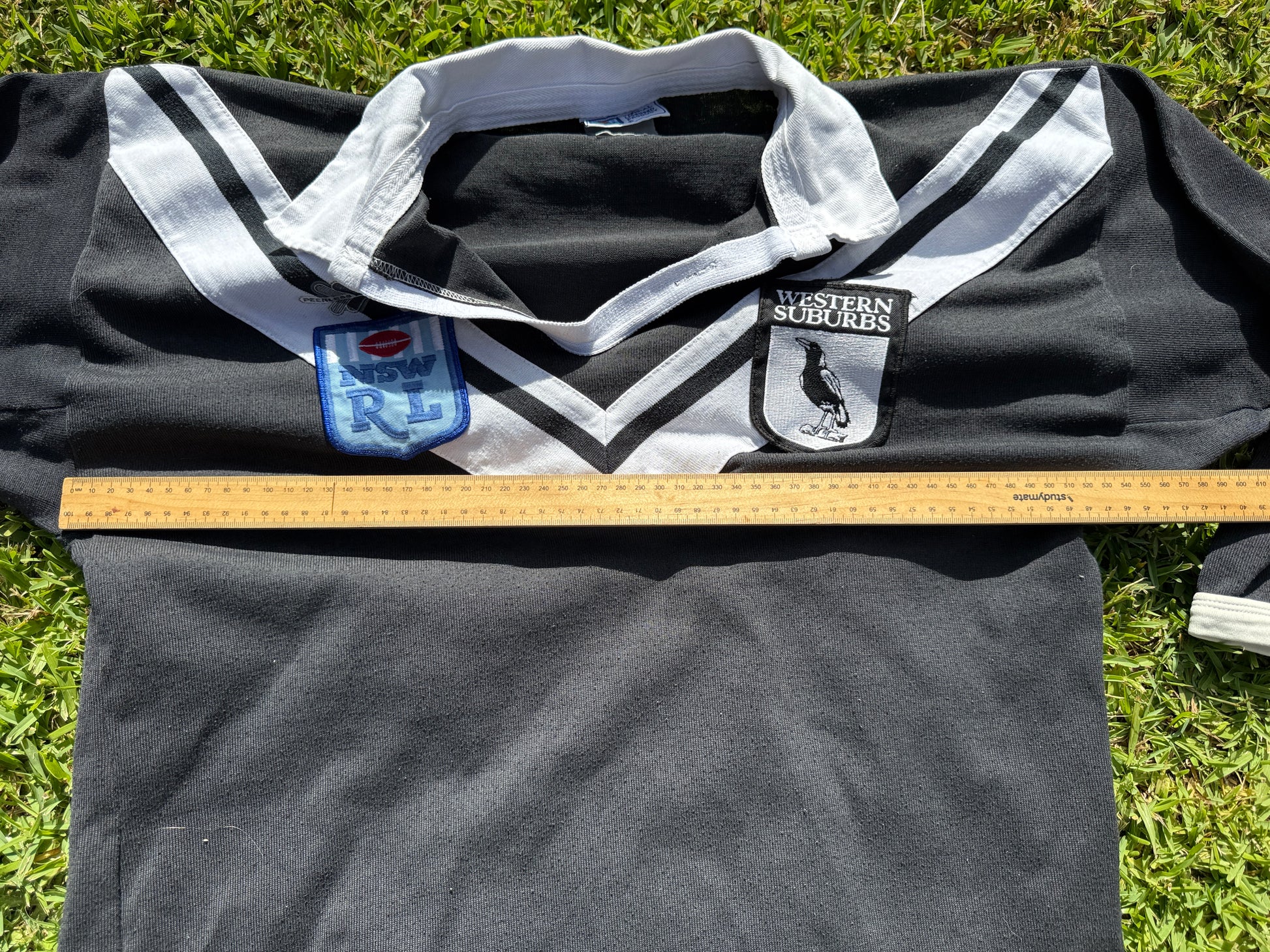 Made by Peerless this jersey is unmarked for size but measures 55cm across the chest (pit to pit), making it like a modern L.