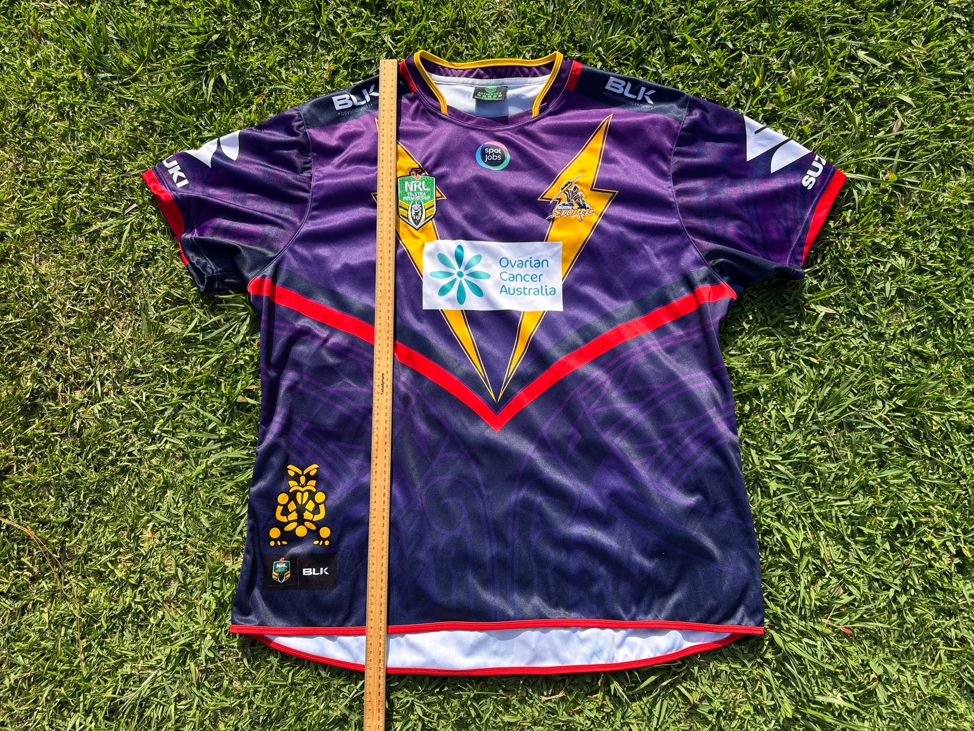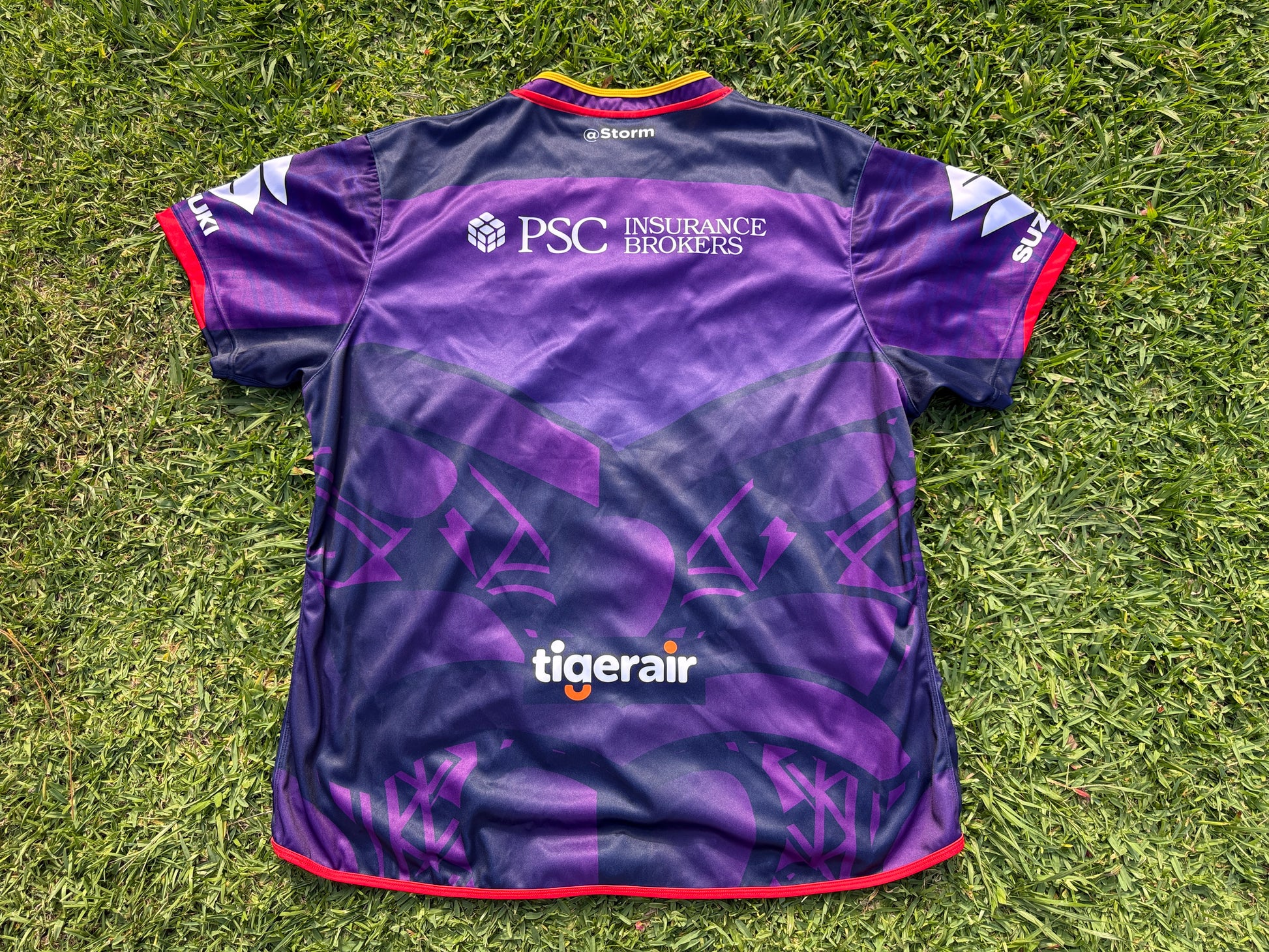 The jersey incorporates several new elements which highlights the different cultures making up the Melbourne Storm family, while staying true to Storm's traditional purple and navy colour base and also containing the Club's signature thunderbolts.